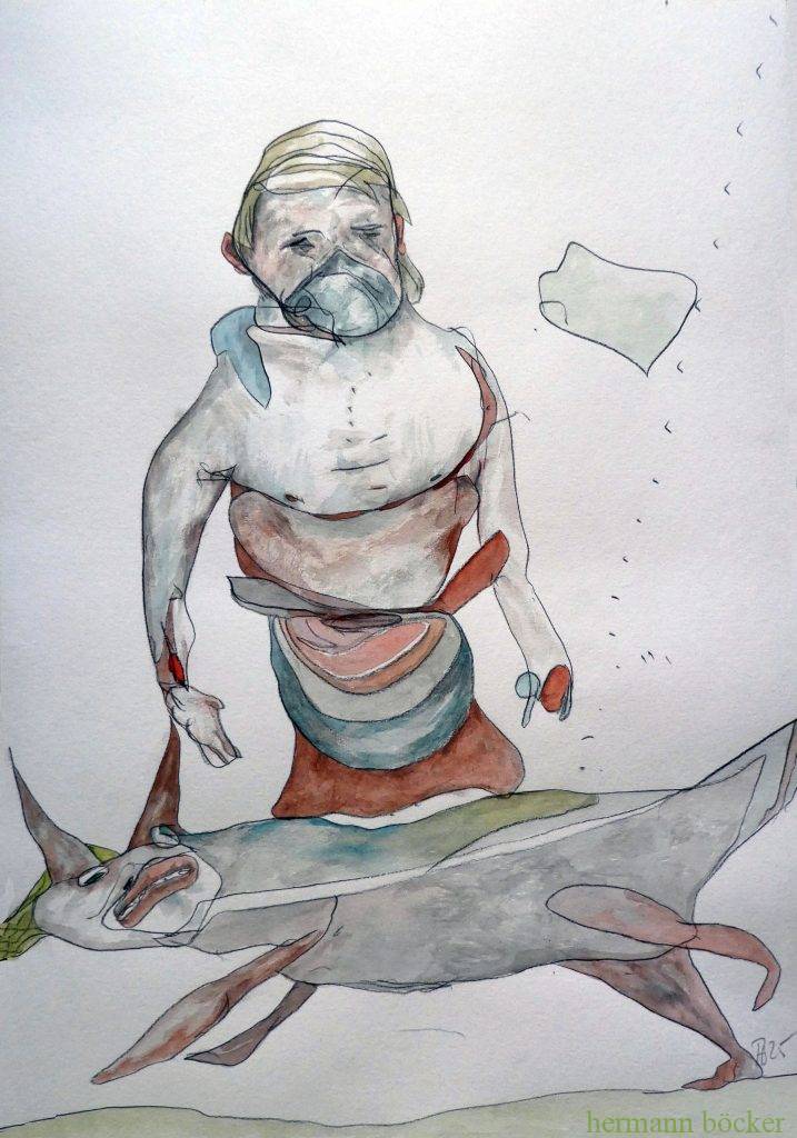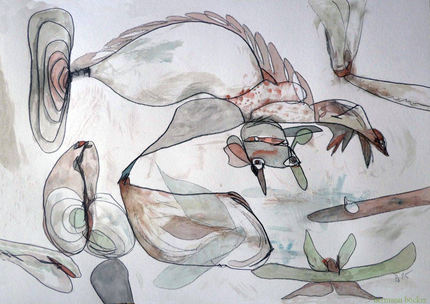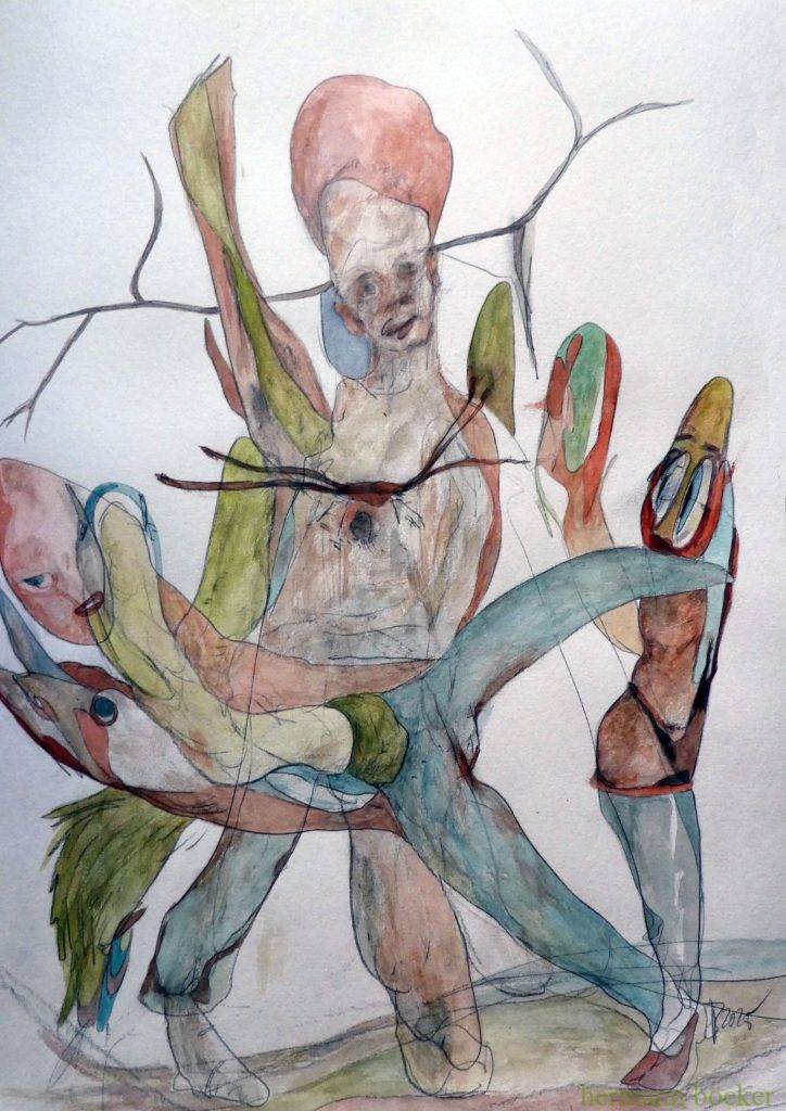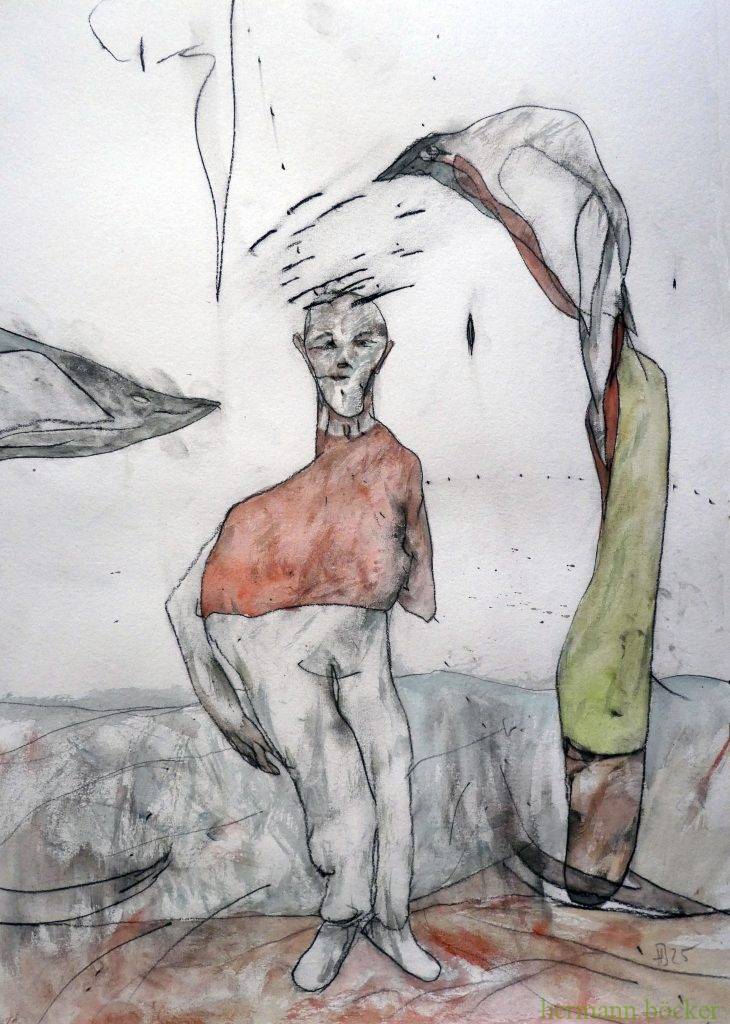 Arbeiten 2025 „Durchdringung“ Bleistift, Aquarell, 56x42cm, 2025 „wahres Mächtnis“, schwarzer Stift, Aquarell, 42x56cm, 2025 „Abasten“, Bleistift, Aquarell, 56x42cm, 2025 „Absacker“, Kohle, Aquarell, 56x42cm, 2025